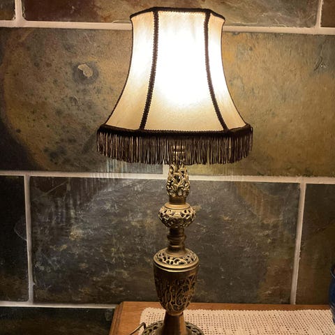 gulvlampe, messing, retro lampe, klassisk lampe, interiør, stoffskjerm, leselampe, vintage stil