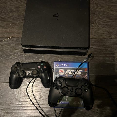 Playstation 4 slim 1tb spillkonsoll med 3 kontrollere. Følgende spill medfølger: Battlefield, Fallout 4, The Elder Scrolls Online og Watch Dogs. Spillkonsollen er svart og designet for hjemmeunderholdning.