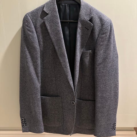Dressmann ullkåpe i størrelse 54R (tilsvarer en XL) for menn. Den har dobbelspent knappelukking og klassisk krage. Passer som pen ytterjakke i kaldt vær.