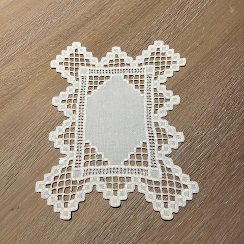 Overskrift: Stor hvit duk med Hardangersøm (90 x 130 cm)
