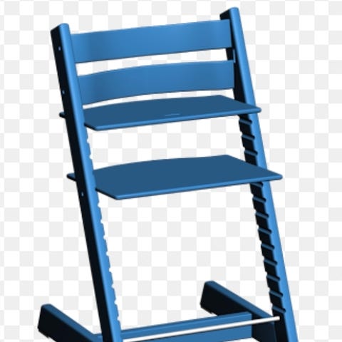 Stokke Høy barnestol i blå farge. Barnestolen har justerbare seter og fotstøtte for tilpasning til barnets størrelse. Stolen er laget i tre og har noen bruksmerker og slitasje. Egnet for barn som trenger en høy stol til spisebord eller andre aktiviteter.