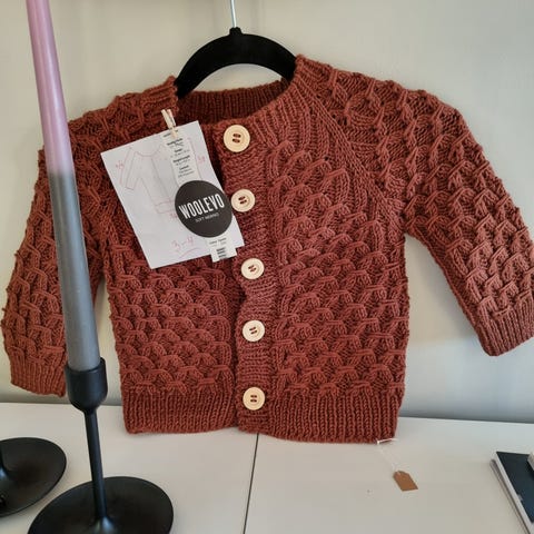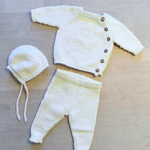 Hjemmestrikket Ellens hentesett fra Petite Knit i str 3-6mnd. Strikket i en nydelig brun farge (muldvarp) i ullgarn og med treknapper. Buksen har strikk i livet som er mulig å stramme ved behov. Hentesettet består av bukse, omslagsjakke og kyse. Helt nytt og aldri brukt.