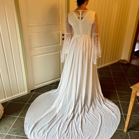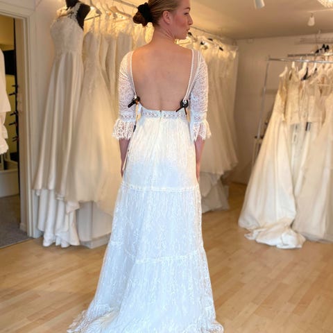 Bohemsk brudekjole i størrelse M. Kjolen har lange ermer, brodert mønster og en åpen ryggdetalj. Trenger en rens før bruk.