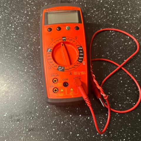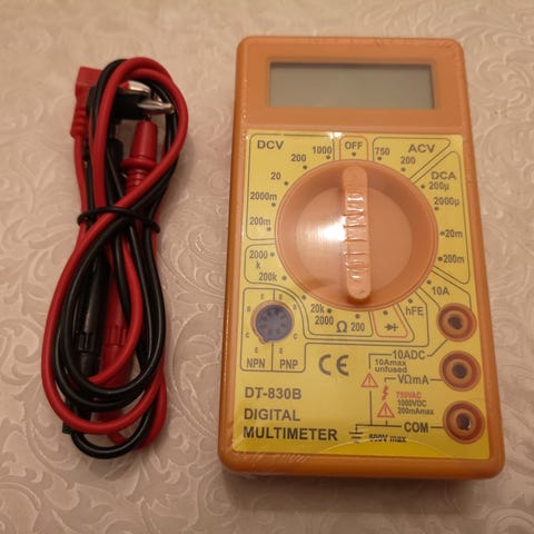 Oklut B34 digital multimeter med målefunksjoner for spenning, strøm og motstand. Enheten har en digital skjerm og leveres med testledninger. Egnet for elektriske målinger i ulike sammenhenge
