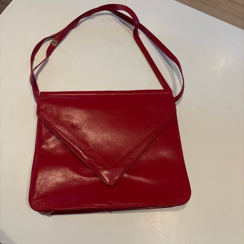 Skinnveske for dame laget i lær. Vesken har en brun farge og en skulderrem for bæring. Den har glidelåsdetaljer foran og bak for oppbevaring av små gjenstander.