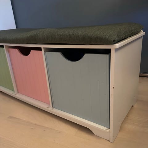 IKEA Oppbevaringsbenk for barn i hvit farge. Benken har et enkelt design med to håndtak for enkel åpning og lukking. Egnet for oppbevaring av leker eller annet barnerelatert utstyr. Pute medfølger. Må hentes.