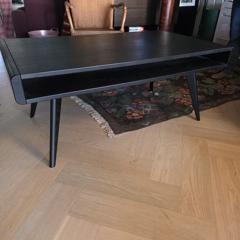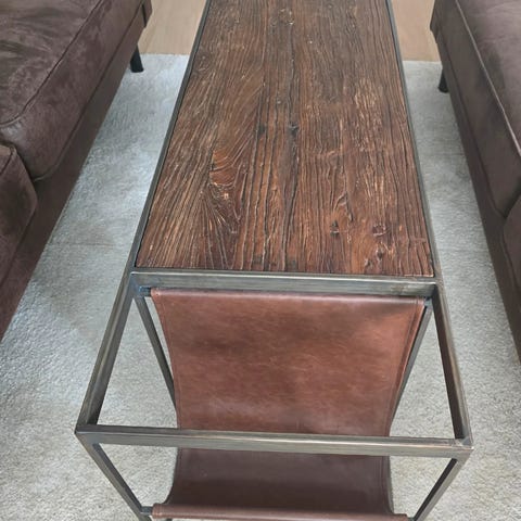 Bordet er laget av en rot som har ligget i bunnen av en elv på fjellet, og naturen har vasket den ren og pen. Glassplaten er kuttet til for å passe perfekt til rotens fasong. Et lite metallsylinder er satt inn for å gi et moderne/industrielt preg.