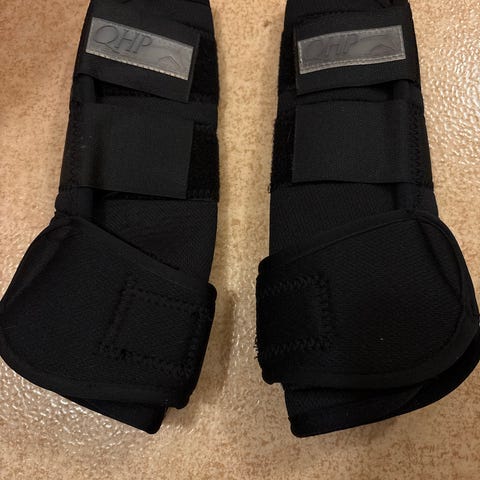 QHP Beskyttelsesbandasjer i størrelse S, farge sort. Laget for å beskytte hestens bein under trening eller transport. Justerbare borrelåsfester for enkel tilpasning.