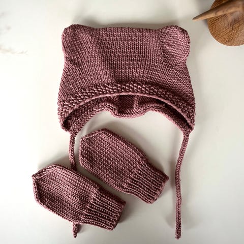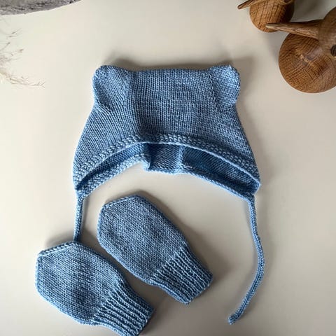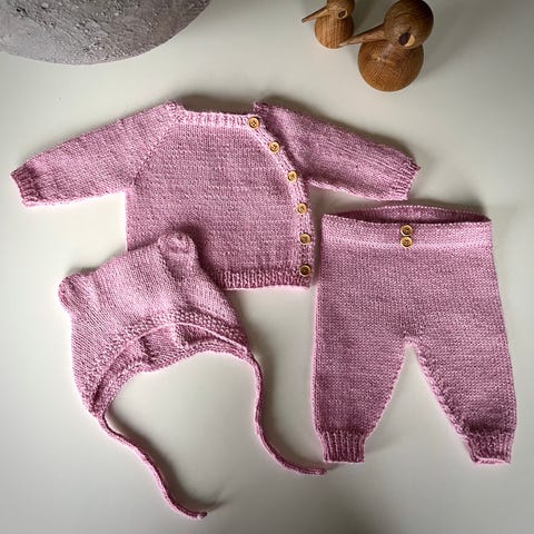 Hentesett babystrikk baby strikkeplagg hjemmestrikk lillebjørn lue