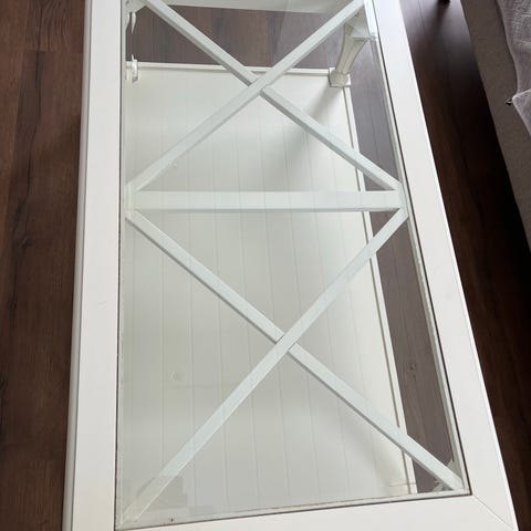 Ubrukt sofabord fra Bohus. Hvitt bord med glassplate. Kun stått til lagring, små merker kan forekomme.