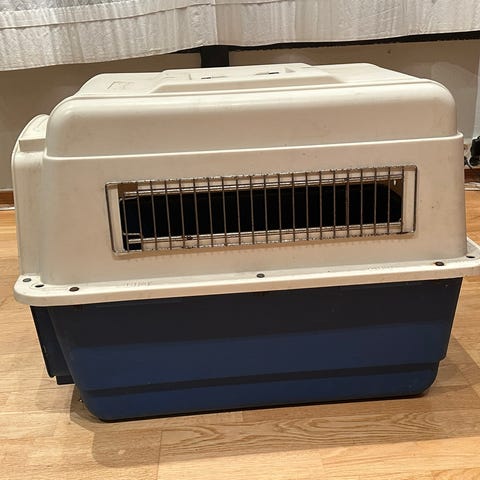 Canem transportbur i grått stoff med nettingvinduer for ventilasjon. Svært lite brukt (om det i det hele tatt noensinne ble det husker jeg ikke, men prislappen er iaf fortsatt på).