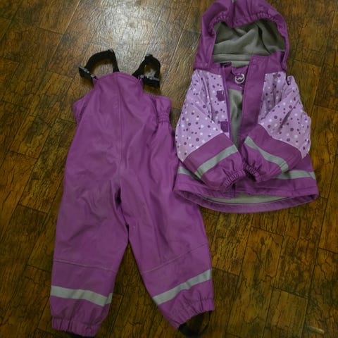 Fint regnsett i str 86/92. Slitasje på knapper (kun estetisk) og noen flekker hvor fargen har skallet av litt (kun estetisk). Mangler strikk under den ene foten på buksa.