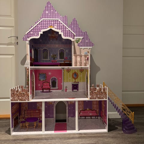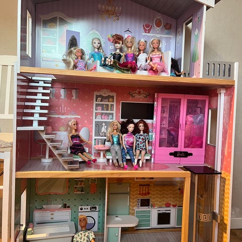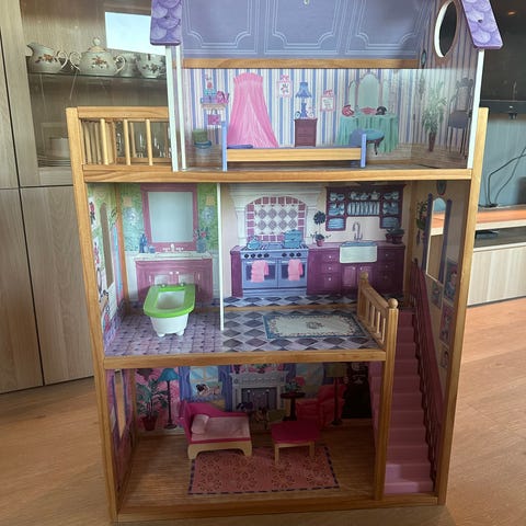 Barbie dukkehus lekehus og detaljer som vinduer, dører og innredning. Lekeplassen har fargerike vegger og ulike møbler som kjøkkenutstyr og dekorative elementer. Passer for barn som liker rollelek med dukker.