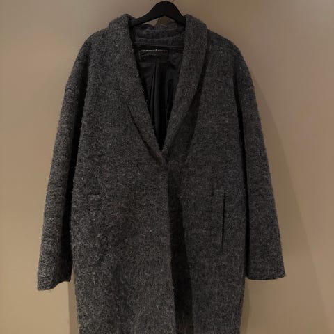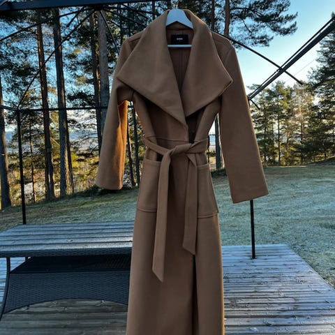 Nydelig kåpe oversize rettmodell, i brun/oker farge, Str. XS-S, men vil passe str. M også. Kåpen har en lang modell med to store lommer foran og en klassisk krage.