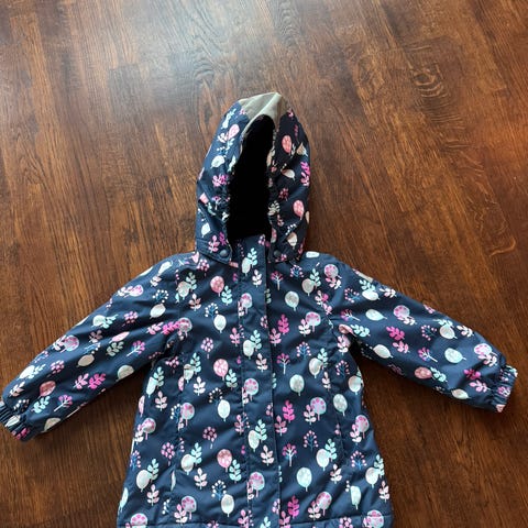 Varm jakke med hette og fuskepels, samt glidelås og trykknapper. Jakken har noe synlig slitasje i ermekant (se bilde) og litt generell bruk nederst, men ellers hel og funksjonell. Passer fint som ekstra-/reservejakke til barnehage/skole.