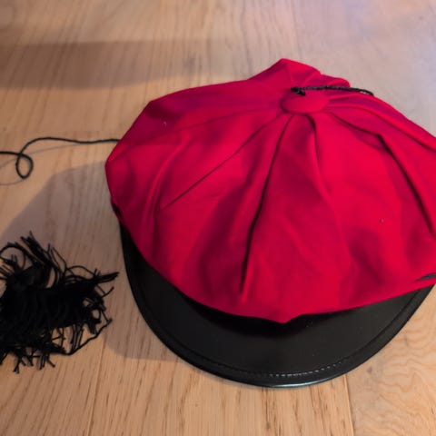 Selger en pent brukt rødrusselue i størrelse 57. Uten flekker eller skrift. Kan hentes etter avtale på Lørenskog eller sendes mot frakt.