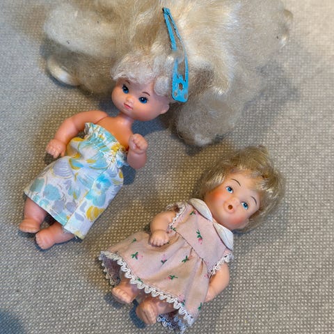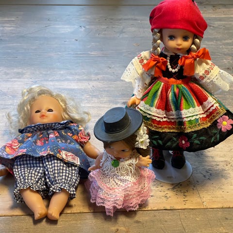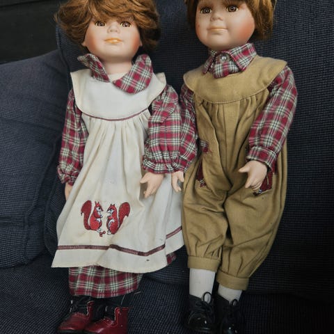 Tvillingjenter! To vintage dukker, i fin stand. Dukkene er 29cm. Bak på den mørke kan man lese Belgium, og Unica. Fine detaljer, har komplett fingre, tær og hår. 200kr pr stk. Selges helst samlet for 350kr
