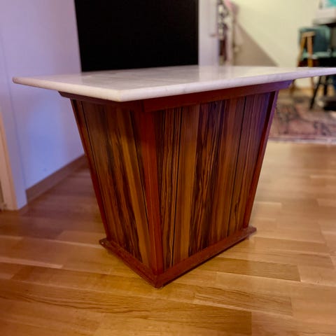 Bordet har vært i bruk, så det har fått noen bruksspor. Ellers er bordet stødig og solid. Den flettede hyllen er intakt og i pen stand.