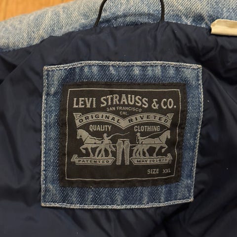 Levi's vinterjakke i denimmateriale, størrelse XXL, farge blå. Jakken er foret med et lyst, mykt materiale for ekstra varme og komfort. Passer til utendørs bruk i kaldt vær. Noe kaffeflekker på foret og slitt, eller mel på høyre framlomme. Går nok fint av i vask.
