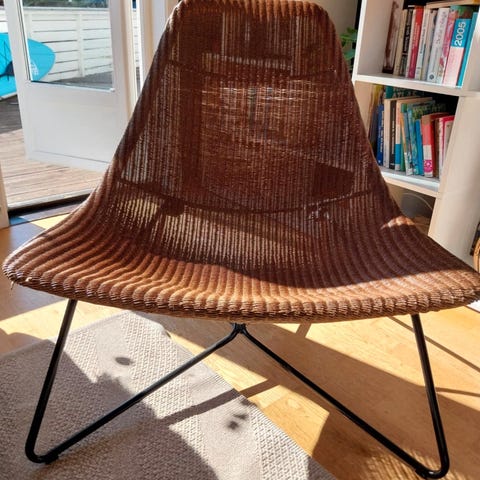 Fin lenestol i brunt skinn selges rimelig pga flytting. Pen, med mindre bruksmerker. Må bæres ned fra 2.etg.