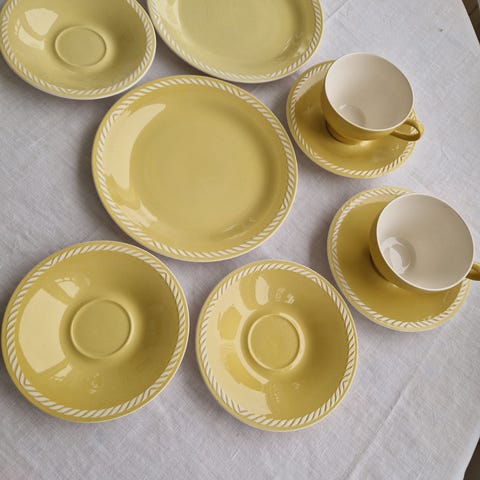 Figgjo Gul Sissel frokost/kaffeservise til 6 personer med eggeglass, liten krukke med lokk og påleggsfat.