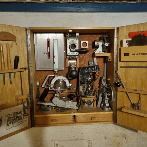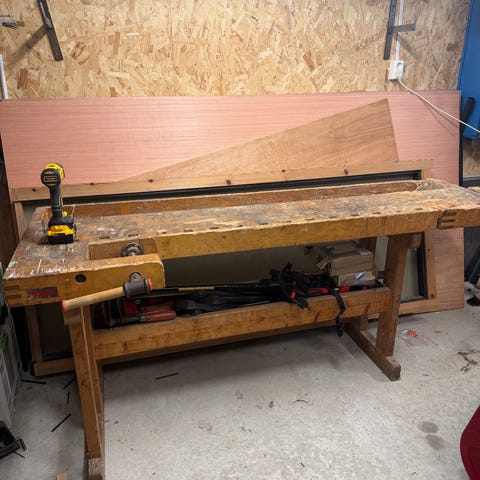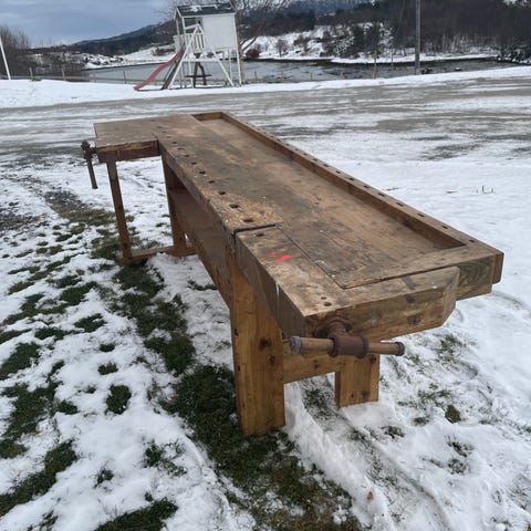 Arbeidsbenk i tre med integrert skrustikke. Benken har flere hull for feste og arbeid med ulike materialer. Solid konstruksjon egnet for håndverks- og snekkearbeid.
