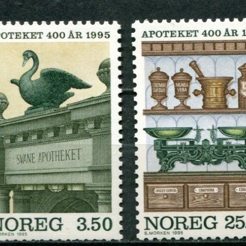 Apoteket 400 År 1995 frimerke med motiv av en svane og apotekets fasade. Frimerket har historisk betydning knyttet til apotekets 400-årsjubileum. Sendes som vanlig post