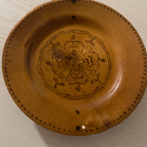 Håndlaget dekorativ trefat med malt mønster i røde, brune og svarte farger. Fatet har en lang og smal form med en blank overflate. Passer til dekorasjon i hjemmet.