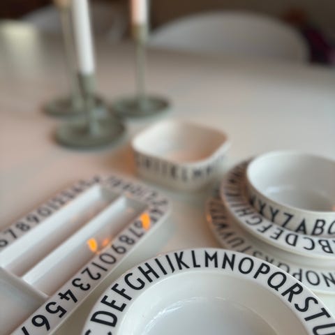 Design Letters barnebestikk melamin fra Design Letters er et sjarmerende bestikksett fra Arne Jacobsen Kids Vintage, designet av Tobias Jacobsen. Med lekfull typografi som oppmuntrer til bokstavlek ved bordet gjør de måltidet både morsommere og tryggere for barn. Bestikkene er slitesterke, lette å gripe og enkle å holde rene, noe som passer hverdagens raske tempo. Perfekt som gave til barn som begynner å spise selv eller som en fin detalj på barnerommet som kombinerer funksjon og glad design.