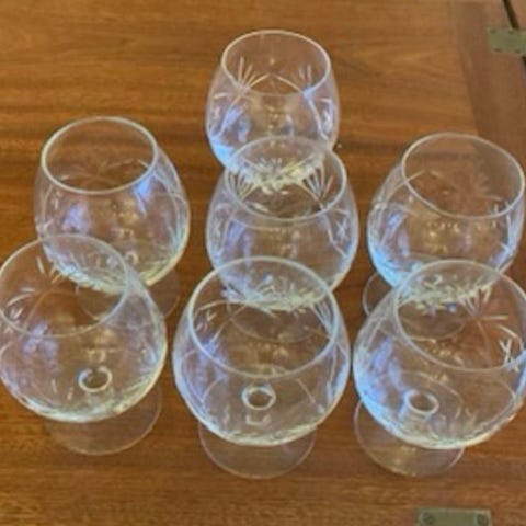 Krystall cognacglass med gravert mønster. Glasset har en bred bolle og en kort stilk, egnet for servering av cognac eller andre brennevin. Materialet er klart krystallglass.