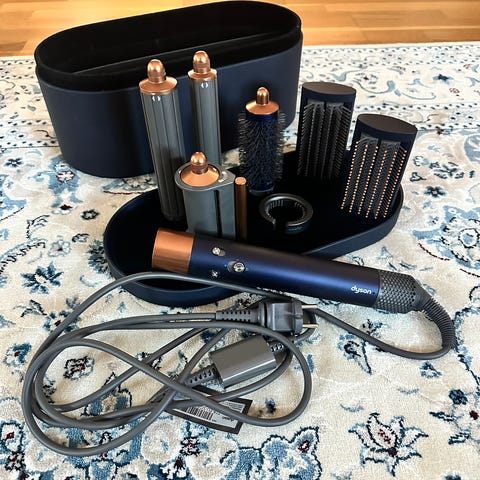 Dyson Airwrap i.d. multistyler med flere tilbehør for hårstyling. Inkluderer ulike børster og stylingverktøy for å skape forskjellige frisyrer. Designet for effektiv og skånsom hårbehandling.