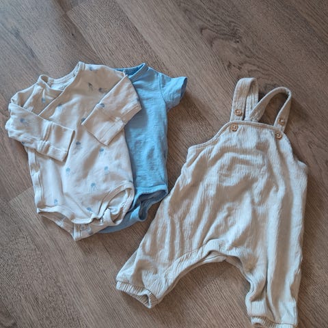 Liten klespakke i str. 56, klær brukt av ett barn. Inneholder en body, en kjole med body under og en pysj. Klærne er fra KappAhl og H&M.