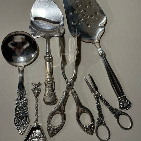 Stilrent og funksjonelt design. Noen brukstegn og slitte detaljer. Designet av Guttorm Gagnes i 1932 Bestikkdelene har vært i eie hos Magnus Poulsson (en av arkitektene bak rådhuset i Oslo).