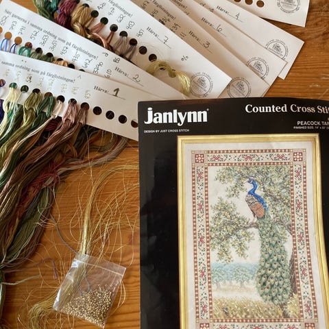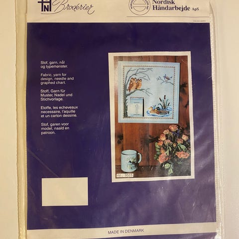 Komplett broderisett med fargemønster, Zweigart 14 count bomullsstoff, bomullstråder fra Madeira og nål.
