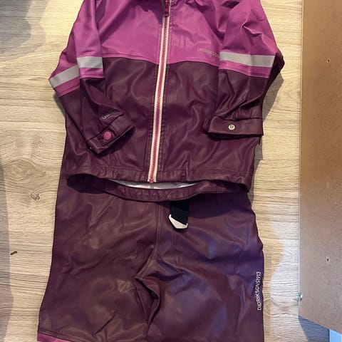 Pent brukt regntøy med fleecefôr i str 90. Regntøyet fremstår som pent brukt.