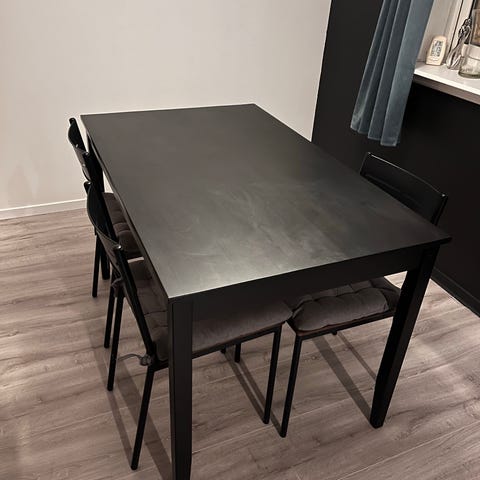 Møblene er opprinnelig en trehvit Bahus spisegruppe fra 1990 tallet som vi har malt og behandlet. De er av god kvalitet og norsk håndverk. Bordet har vitnet og vokset bordplate. Kan pusses flere ganger og behandles etter eget ønske. Bordet har tre i leggsplater slik at det lett gir plass til 14 personer, kanskje fler. Skjenken er 190 cm høy og 130 cm bred. God lagringsplass. Vi har malt den i vegg fargene. Stolene følger ikke med men vi har 6 stoler (se bilde) som kan følge med om en ønsker det. Må hentes og vi prioriterer de som ønsker hele møblementet