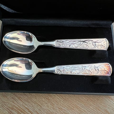 Selger 11 kaffeskjeer, og en spiseskje og gaffel i merket Vidar fra Th. Martinsen fra Tønsberg. Alle delene har skytteremblem.