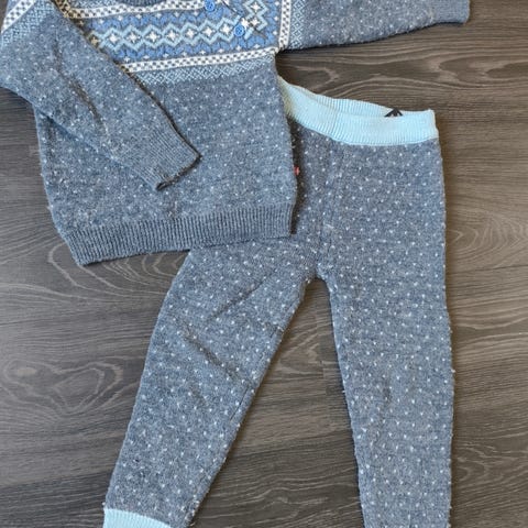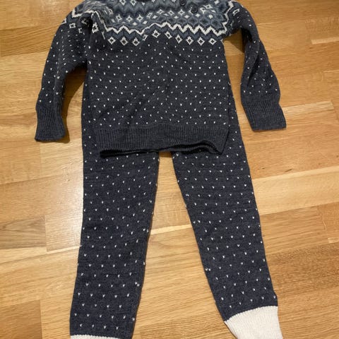 Jotunheim barneklær sett i størrelse 110, unisex. Settet består av plagg laget av 60 % merinoull og 40 % akryl, i oransje og hvite farge. Materialet gir varme og komfort, egnet for barn i denne størrelsen. (4-6 år)