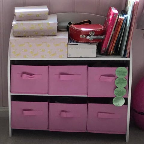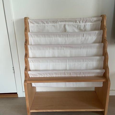 Pent brukt bokhylle som ser ut som et hus. Stått på barnerommet.