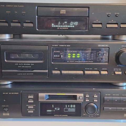 NAD 5420 CD- spiller. Produsert 1991. Alt fungerer ,men mangler lys i displayet pga defekt pære. Visstnok vanlig på denne modellen. Skal være mulig å bytte pære. Tils kr 800 eller bud. Koblet sammen med MARK Prelude anlegg bestående av kassettspiller , 2 stk høyttalere og FM radio med forsterker. Dette anlegget selges for kr 400 . Alt samlet kr 1100 eller bud.