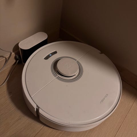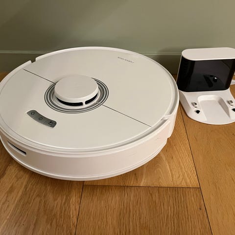 Roborock robotstøvsuger i hvit farge. Enheten har ladebase og er utstyrt med børster og mopp for rengjøring. Den har flere kontrollknapper på toppen for enkel bruk. Designet for automatisk støvsuging og mopping av gulv.