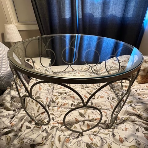 Pent brukt salongbord uten riper og hakk, men 3 små flekker etter et lysfat med møbelknotter under. Finslipte og oljet bordet før jul og trodde flekkene var borte, men så etterpå at de lyste litt gjennom. Vil tro disse går bort ved litt mer sliping enn jeg gjorde ved neste vedlikehold. Se nærbilde