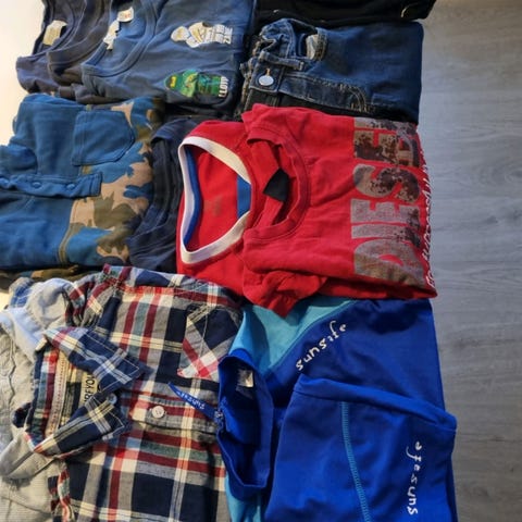 Strikket genser og stripete er ikke brukt, bare vasket og lagt i skapet. Chinos og cardigan brukt én gang.