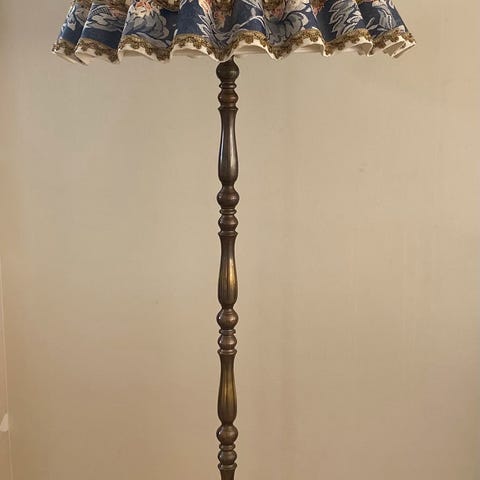 Bordlampe i Tiffany-stil med kuppel laget av farget glass i mønster med druer og blader. Lampens base er en skulptur av en kvinne i bronsefarget materiale. Er tung og mener den heter :The artistic woman?Passer som dekorativ belysning i stue eller soverom. Høyde 65 cm og skjerm 40 cm.Gi bud.