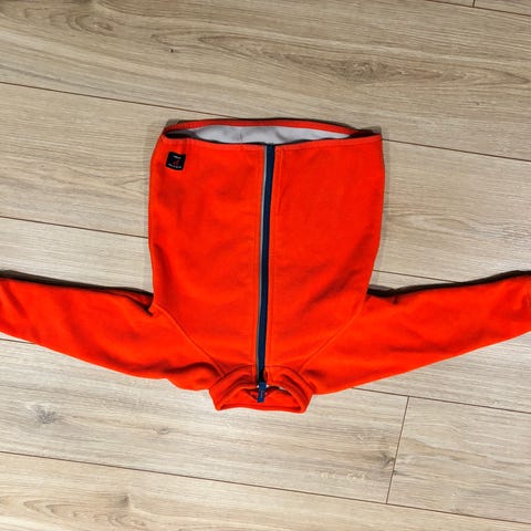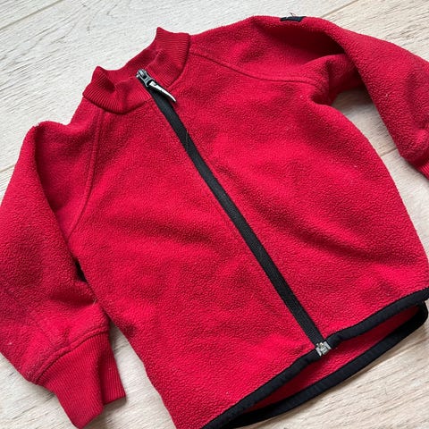 Fleecegenser fra POP som er god og tykk og noe vindtett. Den har dessverre fått misfarging nederst på ermene og litt foran på brystet (se bilder).