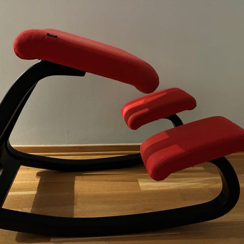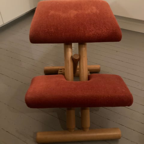 Peter Opsvik sin klassiske design for Stokke fra 1979 som er en del av Nasjonalmuseets samling. Model heter " Variable". Stolen trener kjernemuskulatur og hjelper rygg og nakke å finne en aktiv stilling som er mer naturlig. Stolen er i veldig god stand, fra en røykefri hjem uten kjæledyr. Stolen er omtrekket med ny skummgummi polstring og tekstil. Tekstil er unik og designet av Norsk kunstner Heidi Helland Hansen i neutral fargemønster som passer de fleste interiør. Alle treverk og skruer er solid, hele og pene. Knepute er velpolstret og solid og stol er veldig komfortabellt å sitte på. Fungerer bra som gaming stol, hjemkontorstol, har blitt brukt på middagsbord også. Kan sendes.