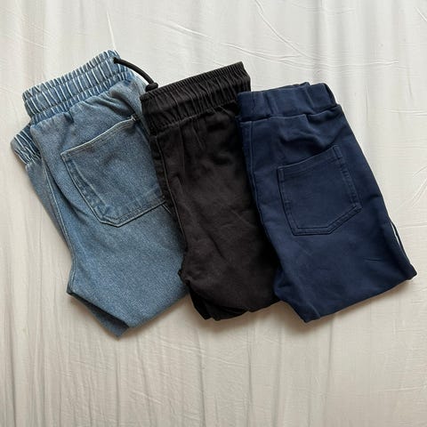 Blanding av pent brukt og godt brukt. To av buksene har slitasje på et av knærne.