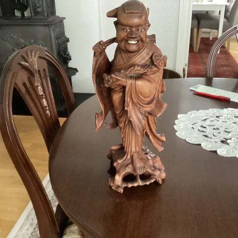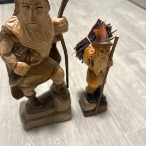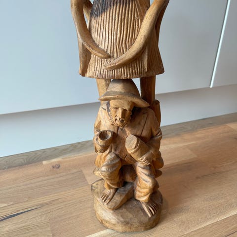 Sett med treskjæringsfigurer laget i tre. Inkluderer figurer av mennesker i ulike positurer, blant annet en person med paraply, en fisker i båt, og en person med opphøyde armer. Håndlaget med detaljert treskjæring.