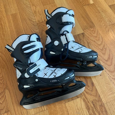 Justerbare skøyter størrelse 30-33 fra Skaterix. Kjøpt på Sport 1. Justerbar barneskøyte som passer til lek og spill. Skøyten er varm og komfortabel på foten. Den har et enkelt justerbart knapp system som dekker 4 størrelser. Skøyten er meget enkel å ta av og på med borrelås og jekkespenne for bedre stabilitet. Godt brukt, men masse bruk igjen. Nypris 499,- Kan sendes eller hentes på Bærums Verk.