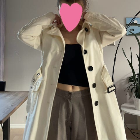Trenchcoat dame i størrelse S, beige farge, laget av polyester. Jakken har dobbelspent knappelukking og en kort, lett design som passer til ulike anledninger.